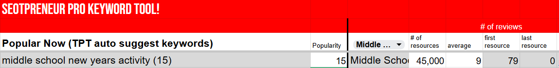 Here’s an example of a keyword that wouldn’t have shown up in TPT search before because the popularity of 15 is below the previous cut-off threshold of 20.