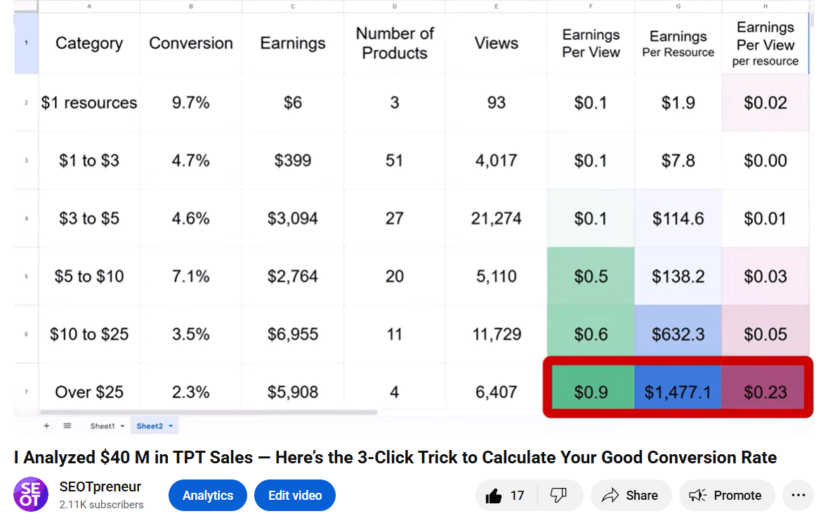 In my store, the products that earn me the most money per view are bundles over $25. Even though they don’t sell as often (only a 2.3% conversion rate), they still bring in the most.