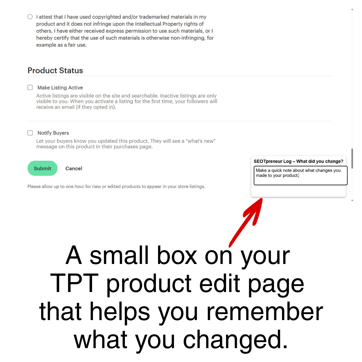 I use a free Google Form to keep track of changes I make in my TPT store. It sends the info to a Google Sheet, so I can see what I changed for each product.