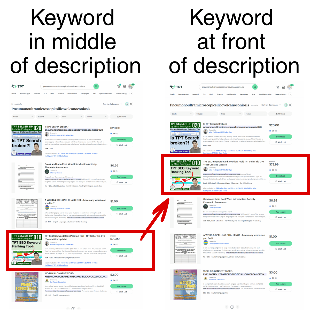 I just found out that if you put the keyword at the start of your product description, it can help your product rank higher. If the keyword is in the middle, it doesn’t work as well.
