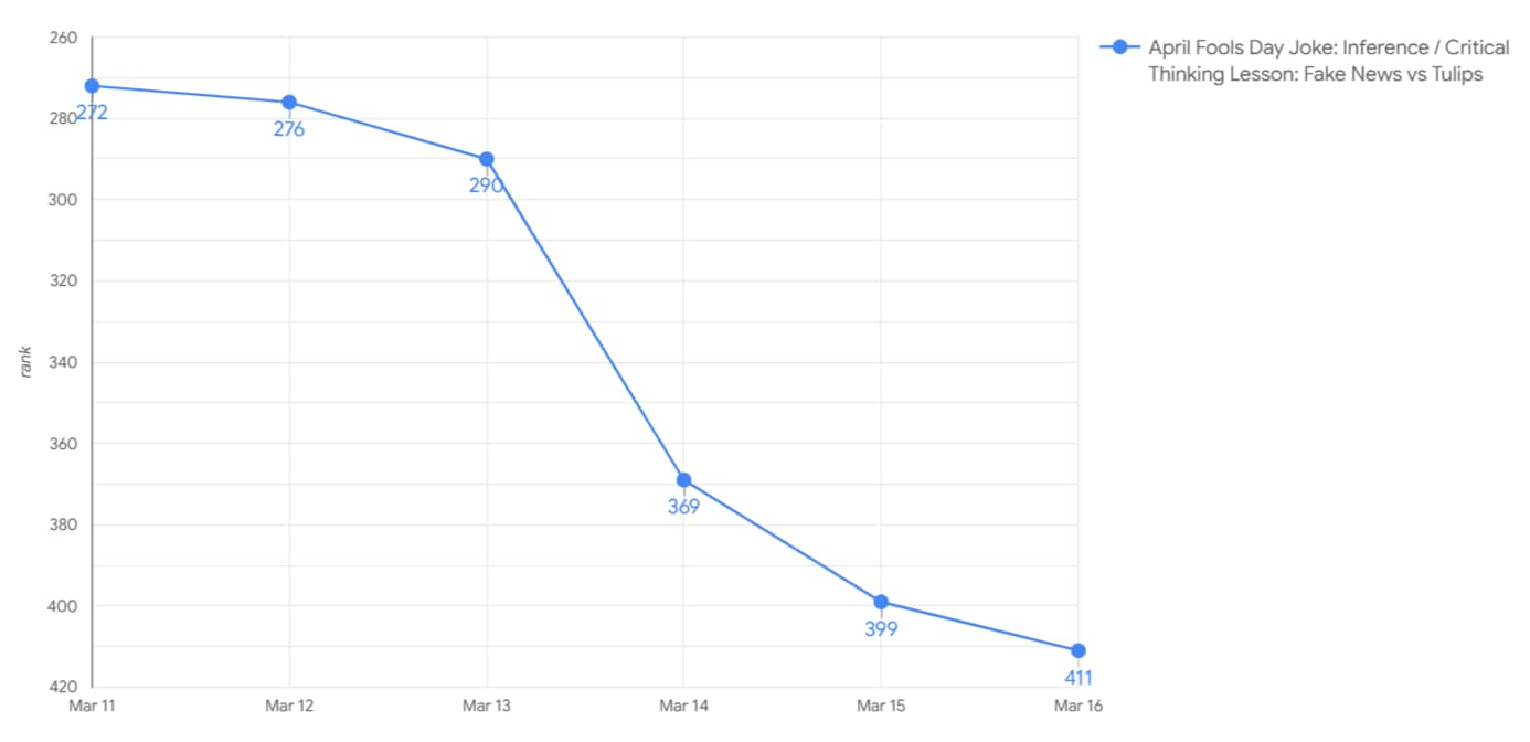 But instead of climbing the TPT ranks for April Fools Day… my resource dropped from position 272 to 411 for “April Fools Day”. 🤯